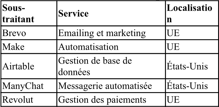Voici la liste de nos principaux sous-traitants qui peuvent avoir accès à vos données personnelles :